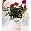 - Deze rode roos heeft diepe, fluweelachtige bloemen en frisgroen blad – een klassiek symbool van liefde en elegantie.