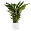 - De Spathiphyllum, ook wel lepelplant genoemd, heeft symmetrisch, donkergroene bladeren die langwerpig en spits toelopen. De bloemen zijn wit en bestaan uit een ovaalvormig schutblad dat een bloeikolf omringt. Deze elegante plant brengt een frisse en rustige sfeer in huis.