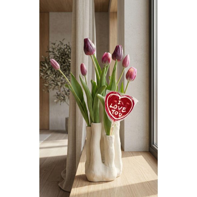 Zeg het met stijl, zeg het met tulpen. Dit kunstboeket combineert diepe rood‑paarse tulpen met een sculpturale multi‑spout vaas. Een echte blikvanger, perfect als cadeau of als blijvend statement in elk interieur. Laat je ruimte bloeien zonder gedoe met water of verwelkte blaadjes. Deze levensechte tulpen blijven het hele jaar fris en kleurrijk. De keramieken vaas heeft een subtiele textuur en een natuurlijke matte afwerking. Specificaties Totale hoogte set: ca. 45 cm Meertuitenvaas met textuur: 6 openingen (steen-/witte kleur) Tulpenboeket: 7 stelen (rood- en paarstinten) Een duurzaam alternatief voor snijbloemen, ideaal als origineel cadeau of om je eigen interieur op te frissen met iets unieks.